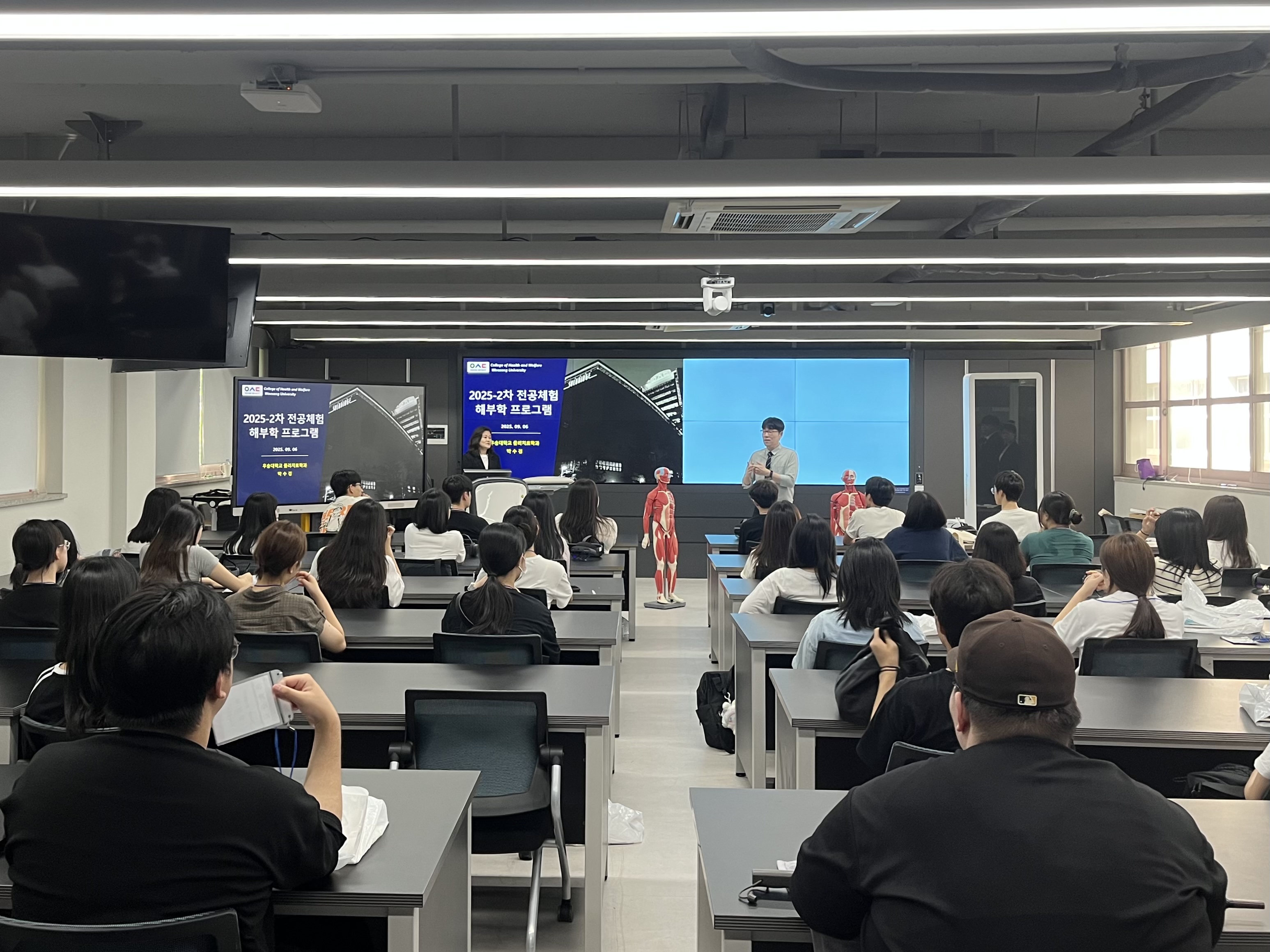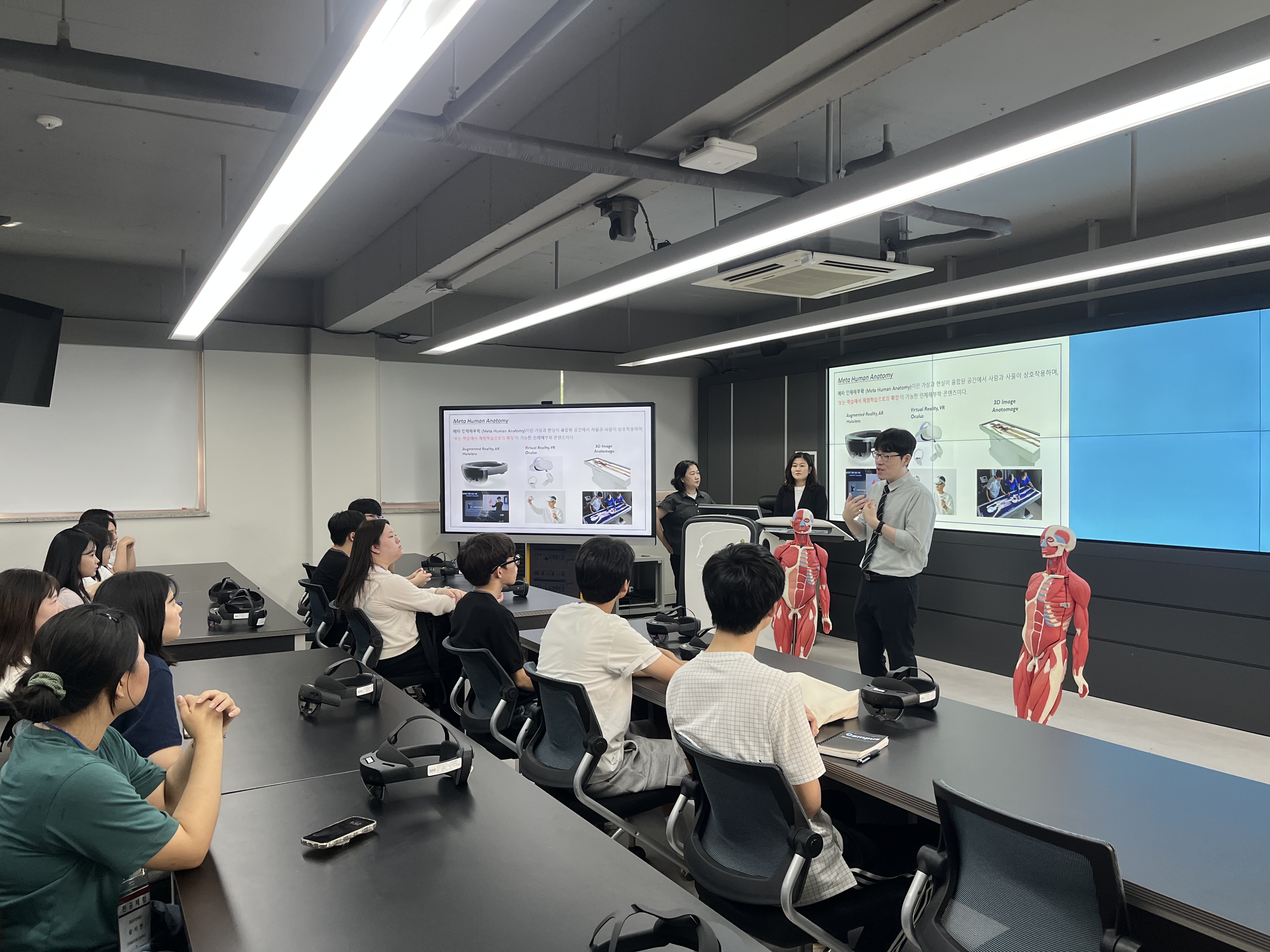 1. VR 해부학실에서 근조직과 뼈대 등과 같은 인체 해부에 대한 VR 체험 실시